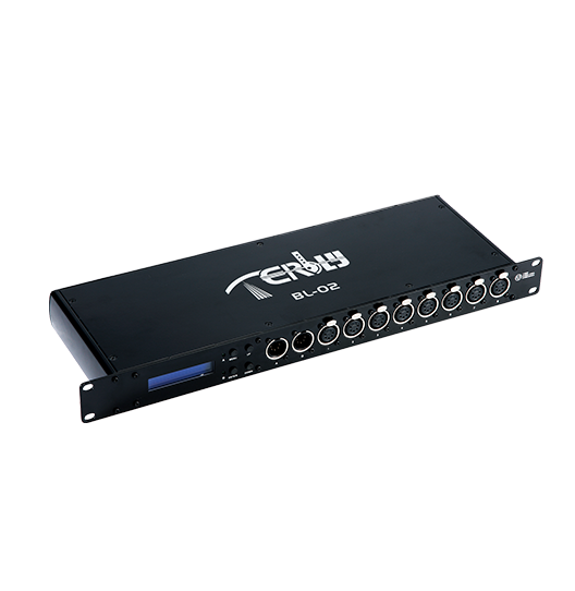 信號從A、B兩個信號端口輸入,可以轉(zhuǎn)置為由8個單獨(dú)輸出端口或4個一組的兩組輸出端口的DMX512標(biāo)準(zhǔn)信號通道,而且具備加強(qiáng)放大信號的功能。